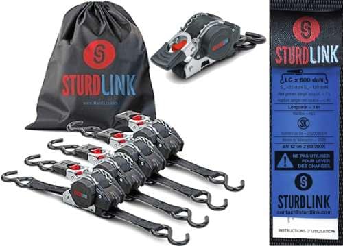 Cinchas de Amarre Automáticas 25mm 3m con Ganchos en S. Lote de 4 correas con carraca de 25 mm de ancho, longitud total de 3m, capacidad de 300kg directos, 600kg U, STF 120daN. Cinta negra, y cada gancho en S recubierto de vinilo negro. Estos eslingas con carraca, de calidad profesional, cumplen la norma EN 12195-2. La bolsa de transporte y almacenamiento suministrada con cada juego evitará que queden tirados en el maletero del coche o en el garaje.