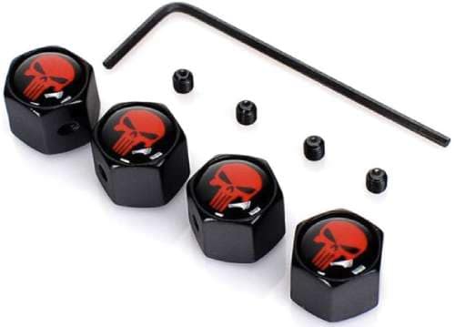 Pack de 4 tapones antirrobo para válvulas de neumáticos. Fáciles de instalar y con diseño de patrón de calavera.