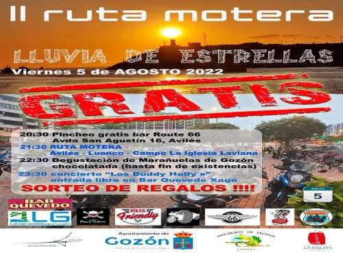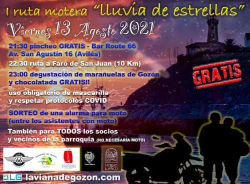 Con el objetivo de avistar las famosas «Perseidas», se convoca cada año desde 2021 ininterrumpidamente una ruta nocturna siempre con Gozón como eje central, y con una ruta que recorre parte del concejo. Durante la actividad se promociona la tradicional «Marañuela de Gozón» y se genera un buen ambiente con los participantes que cada año baten el record de asistencia. La cita se ha consolidado en el calendario motero asturiano, y cada año a mediados de Septiembre tiene lugar este evento motero único en su especialidad. Una ruta diferente edición tras edición introduce novedades y que no para de crecer. No es una concentración, no es una competición, no es un moto-encuentro. Es algo singular y diferente que ofrece totalmente GRATIS y sin inscripción previa, una jornada de entretenimiento. Si eres motero o aficionado a las motos ya sabes que a mediados de Septiembre tienes una cita con la «Lluvia de Estrellas».