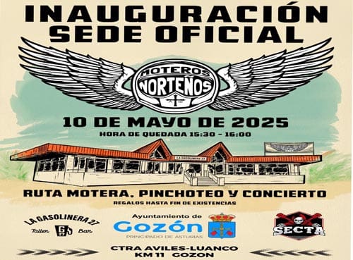 El día 10 de Mayo de 2025 fue el elegido por Moteros Norteños para realizar la Inauguración de su Sede Oficial, que desde entonces es el Bar La Gasolinera 27, en el kilómetro 11 de la Carretera Avilés a Luanco (AS-238).